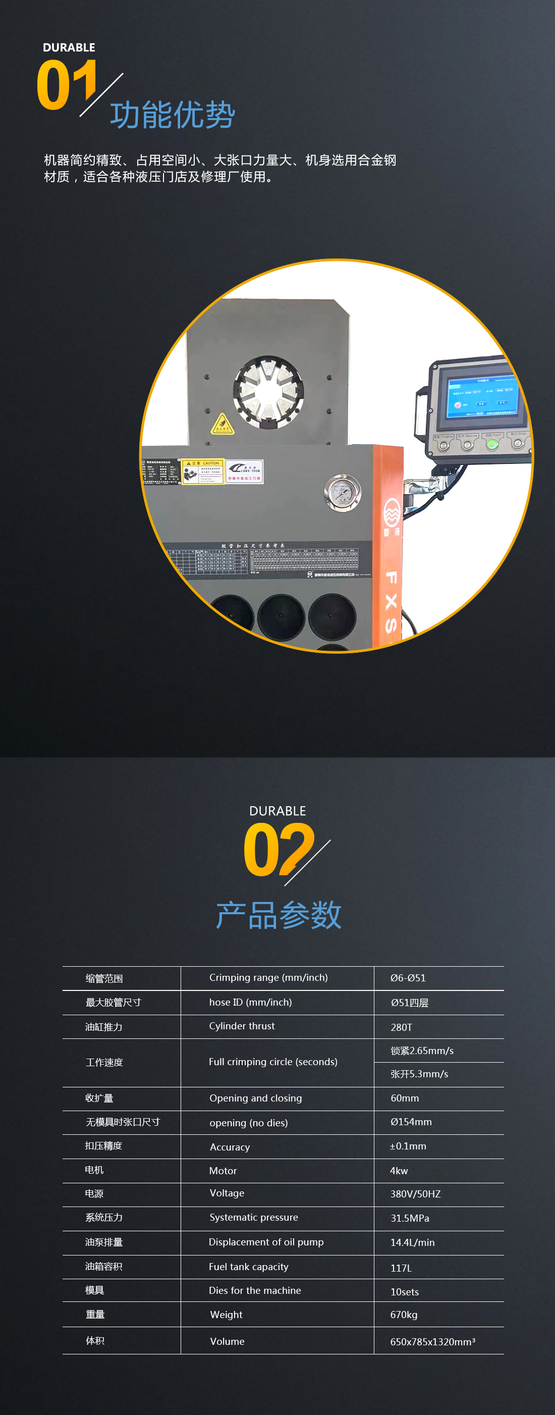 我公司新研發(fā)成功了超薄系列縮管機(jī),扣壓重復(fù)精度可達(dá)到0.1mm。超薄的結(jié)構(gòu)形式克服了傳統(tǒng)環(huán)形扣壓機(jī)固有的不足,能夠非常方便的扣壓形狀復(fù)雜的高壓油管總成和異型軟軸軟管。此款機(jī)器外觀尺寸更小,采用人性化設(shè)計(jì),更方便使用者操作??刂葡到y(tǒng)采用的是PLC+觸摸屏模式,位移傳感器采集信號(hào)精度高,系統(tǒng)可采用手動(dòng)、半自動(dòng)和全自動(dòng)三種模式,用戶可根據(jù)實(shí)際加工的工況非常方便的進(jìn)行選擇,從而大大提高加工效率。在您使用的過程中如遇到有不方便之處請(qǐng)及時(shí)與我們聯(lián)系,我們將以不懈的努力提高您的產(chǎn)品質(zhì)量和工作效率。